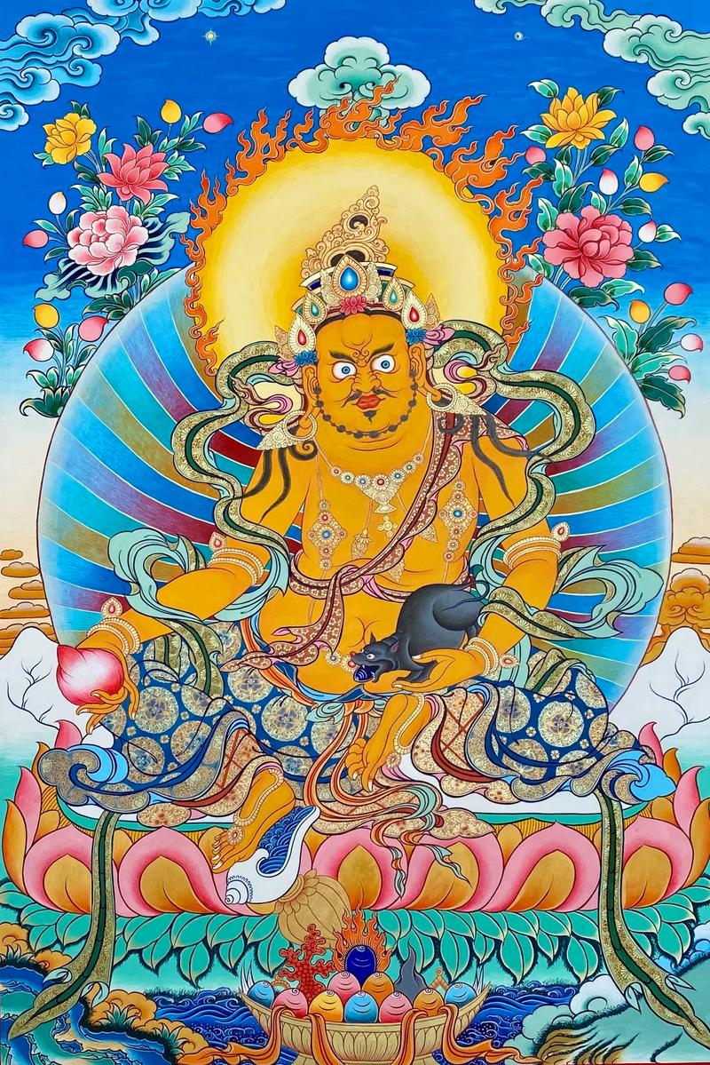 为令密乘行者有资财宏法利生,不被生活所逼,可安心向道,特赐予行者财利丰足。黄财神一面二臂,五佛冠为头饰,矮小肚大,双臂劲力,右手持布拉噶如意宝,左手提着吐宝鼠,身着天衣,蓝莲花及珠宝璎珞作装饰,胸前挂念珠。左足屈,右足踩着海螺宝,以如意姿安座于莲花月轮之上。 黄财神是藏传佛教各大教派普遍供养的五姓财神之一,因其身相黄色,故称黄财神。修持黄财神法、持诵其密咒,可获得黄财神庇佑,能增长福德、寿命、智能、物质及精上之受用,不被生活所逼,以及一切经济压迫,可安心向道。但修法者需发无上菩提心,广结善缘,勤行布施。万勿悭贪成性,护法降罪也. 黄财神即黄布禄金刚,黄财神面慈目善,头戴宝冠,坦胸露腹,戴着珍宝璎珞、珍宝耳环、珍宝手镯和珍宝足钏,上身穿丝制天衣,下身着丝制裙子,右手于右膝上捧喷焰末尼,左手握着吐宝鼬,以威镇坐姿坐在莲花宝座中央。身后有光环、祥云、远山。能增长福德、寿命、智慧、物质及精神上之受用。主司财富,能使一切众生脱于贫困,财源广进。