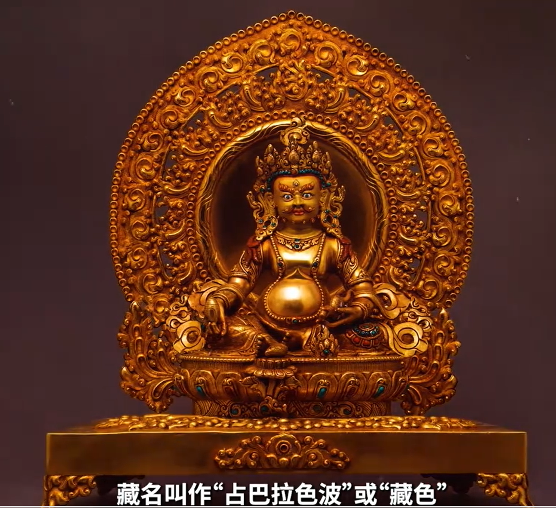 黄瞻巴拉即黄财神:《瞻巴拉修炼方便》中载:宝贝座上雄狮立,莲花宝贝放光芒,方便犹如日月辉,此为财神阿尔亚瞻巴拉。该神身黄挺肚,以绸缎宝贝作装饰;头戴宝冠,花卉耳饰和项链;臂戴臂镯,足饰足镯;上身着衣下身裙,以财运之神而傲立,三目愤怒注视左前方;右手持宝珠置于胸前,左手持吐宝兽置于膝上;两足伸缩有致甚庄严。