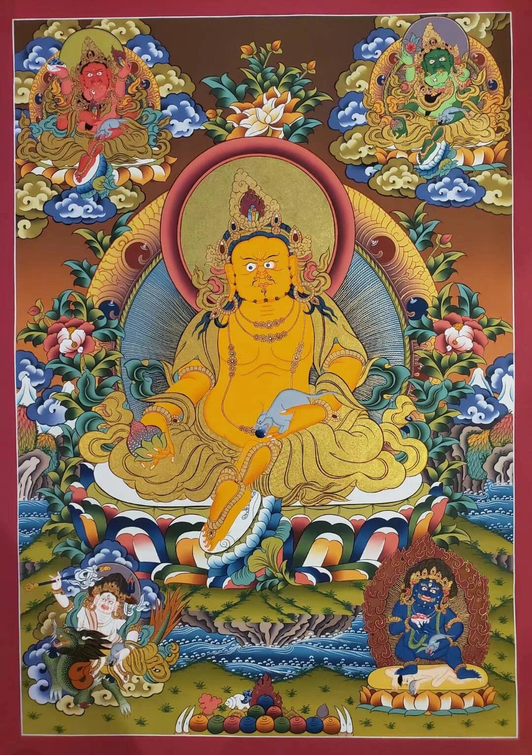 当初释迦牟尼佛在灵鹫山宣说大般若时,诸魔鬼神等皆前来障碍,令高山崩塌,大众惊慌,此时黄财神就现身庇护,后来世尊嘱咐黄财神,当于未来世帮助一切贫困众生,为大护法。诚心诵持黄财神心咒,可获得其庇护,能财源广进,免除贫穷和一切经济窘困。如果能发无上菩提心,发愿救度一切众生于贫困,则福德更不可限量。中央为黄财神,其功德:黄财神是藏传佛教各大教派普遍供养的五姓财神之一,因其身相黄色,故称黄财神。