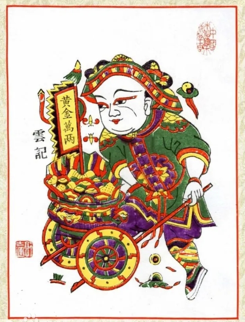 朱仙镇木版年画诞生于唐,兴于宋,鼎盛于明。是中国四大年画之一,也是木版年画的鼻祖。朱仙镇木版年画不仅具有极高的艺术收藏价值,而且极具观赏价值,许多名人都曾收藏过朱仙镇木版年画。 [9]朱仙镇木版年画《柴王推车》,柴王爷即是后周世宗皇帝柴荣,因早年曾推车贩伞商贾出身,故《柴王推车》象征着财源茂盛、满载而归。